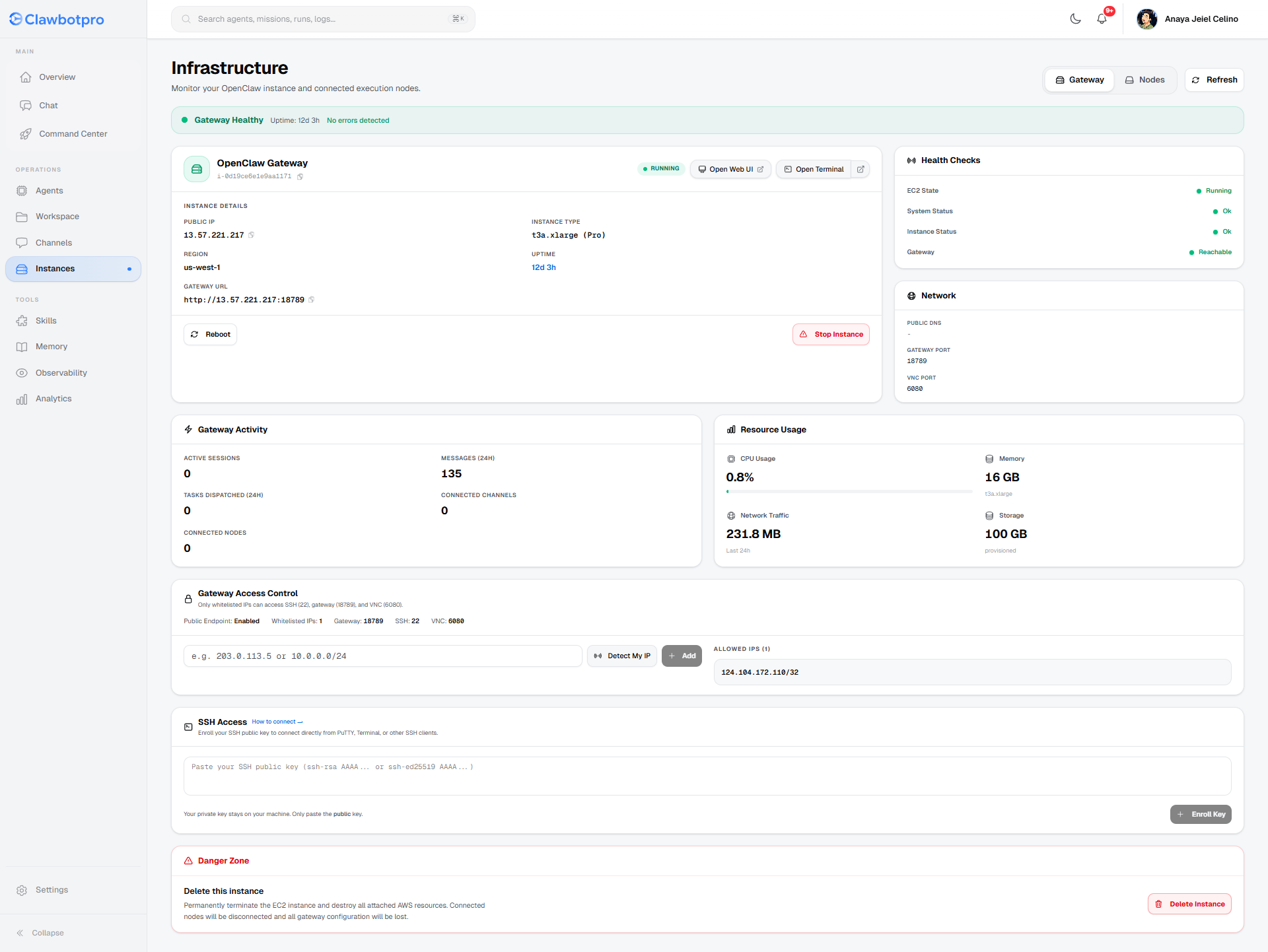The Infrastructure Dashboard (located at /dashboard/instances) provides deep, granular control over your dedicated, single-tenant AWS environment. Here, you monitor health, review resource consumption, manage network access, and control the lifecycle of the underlying compute node powering your AI agents.