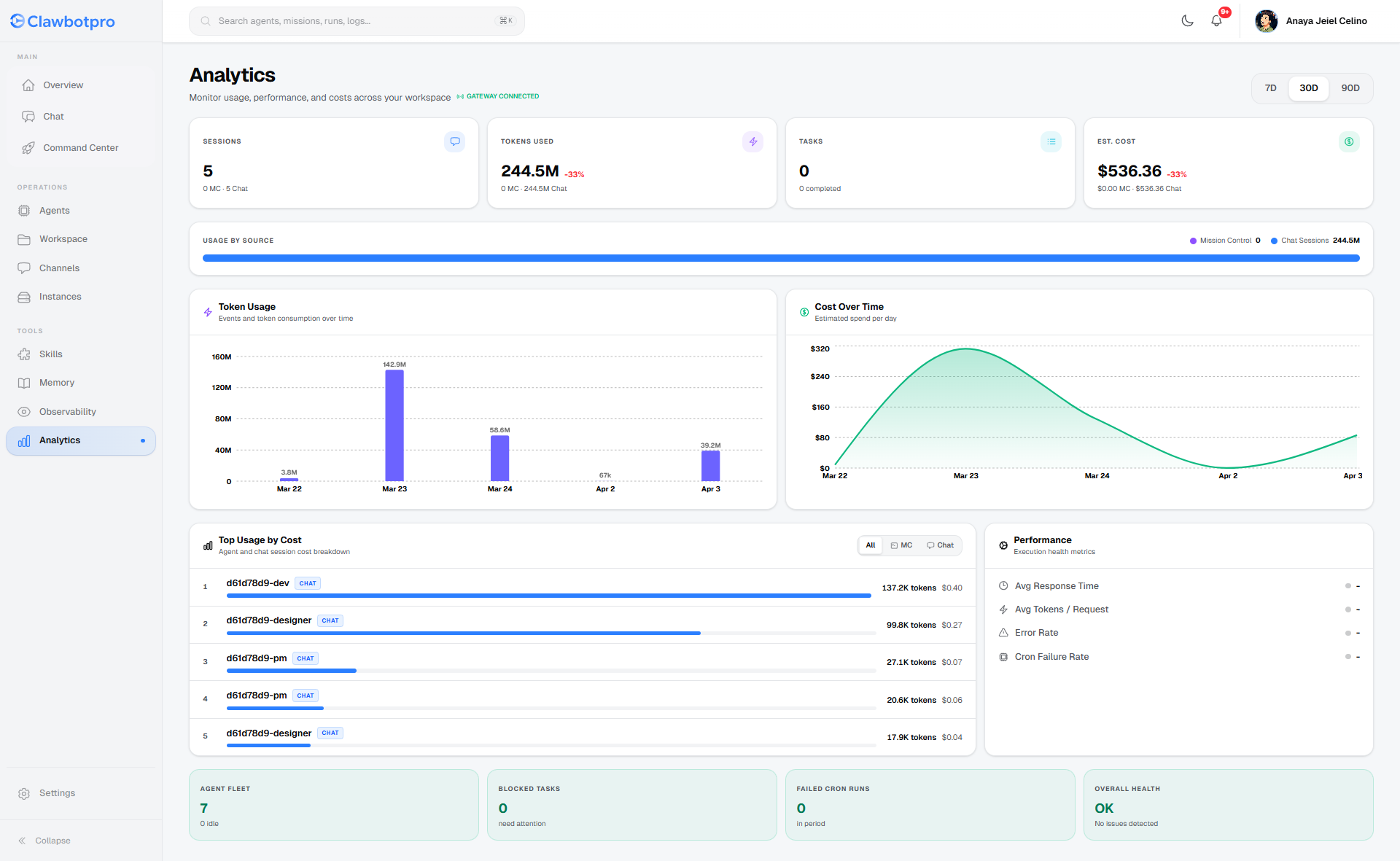 ClawbotPro offers two distinct but deeply integrated views to monitor your autonomous workforce: Analytics (for token costs, trends, and aggregate performance) and Observability (for deep-dive execution tracing, raw terminal logs, and failure diagnosis). Together, they ensure your agents are both cost-effective and perfectly deterministic.