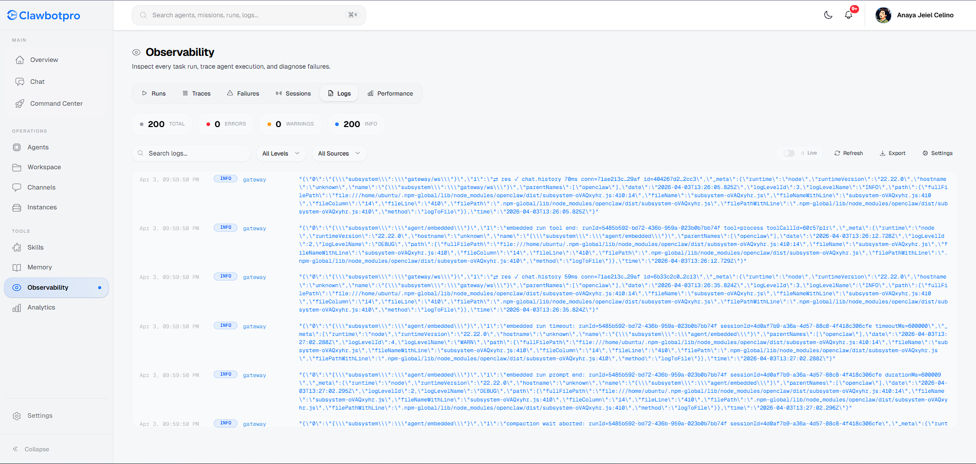 duration_ms), and the exact number of tokens consumed for that specific micro-decision. - Logs (Live Terminal): The Logs tab acts as a remote `tail -f` connection to your OpenClaw EC2 instance. It streams raw standard output (stdout) and standard error (stderr) directly from the underlying node. You can filter logs by severity level (INFO, WARN, ERROR) or by the specific agent subsystem generating them.