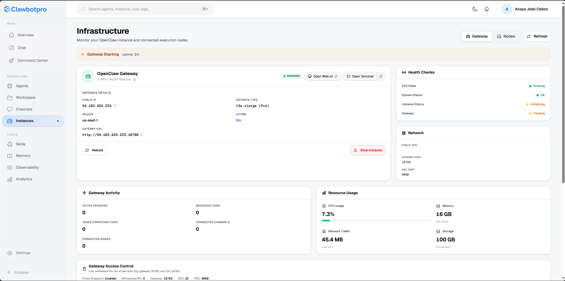 - Instance Details: View your assigned Public IP, AWS Region, and the direct Gateway URL. You can also perform hard reboots or stop the instance directly from here.