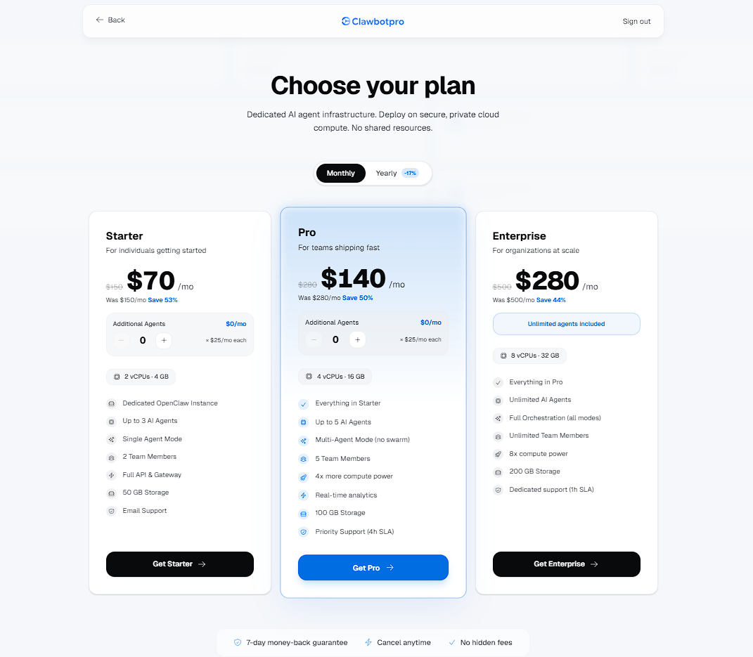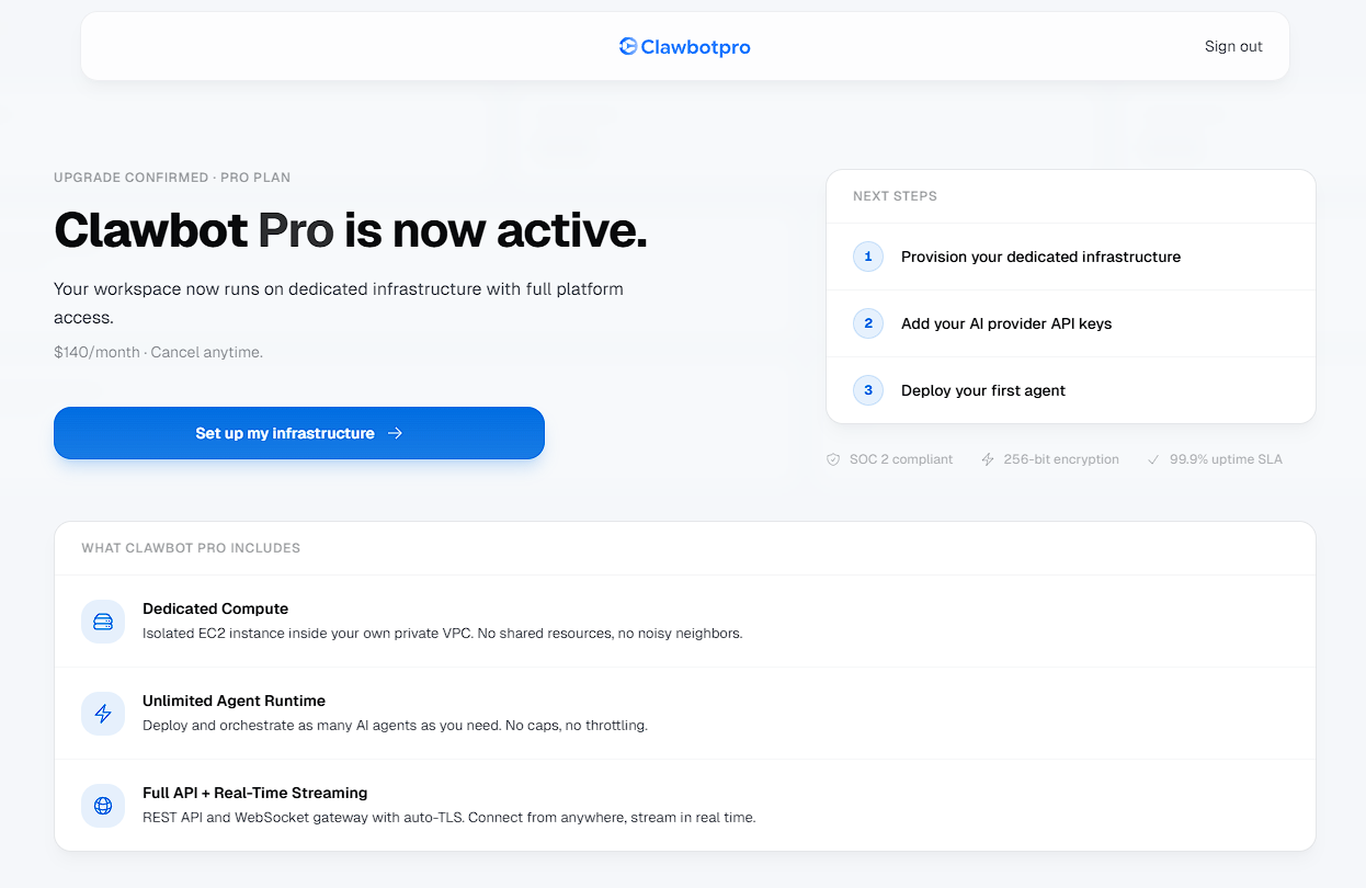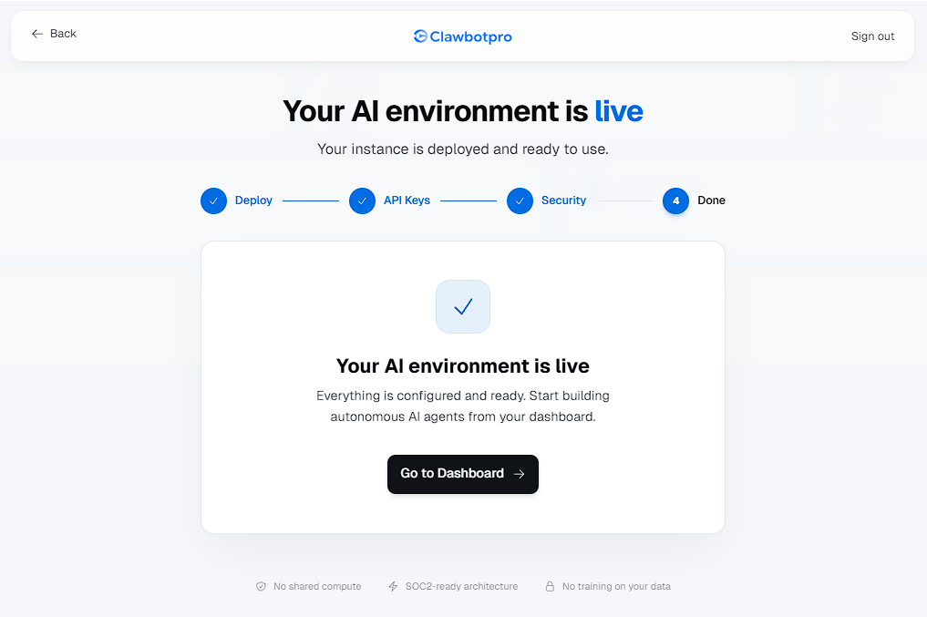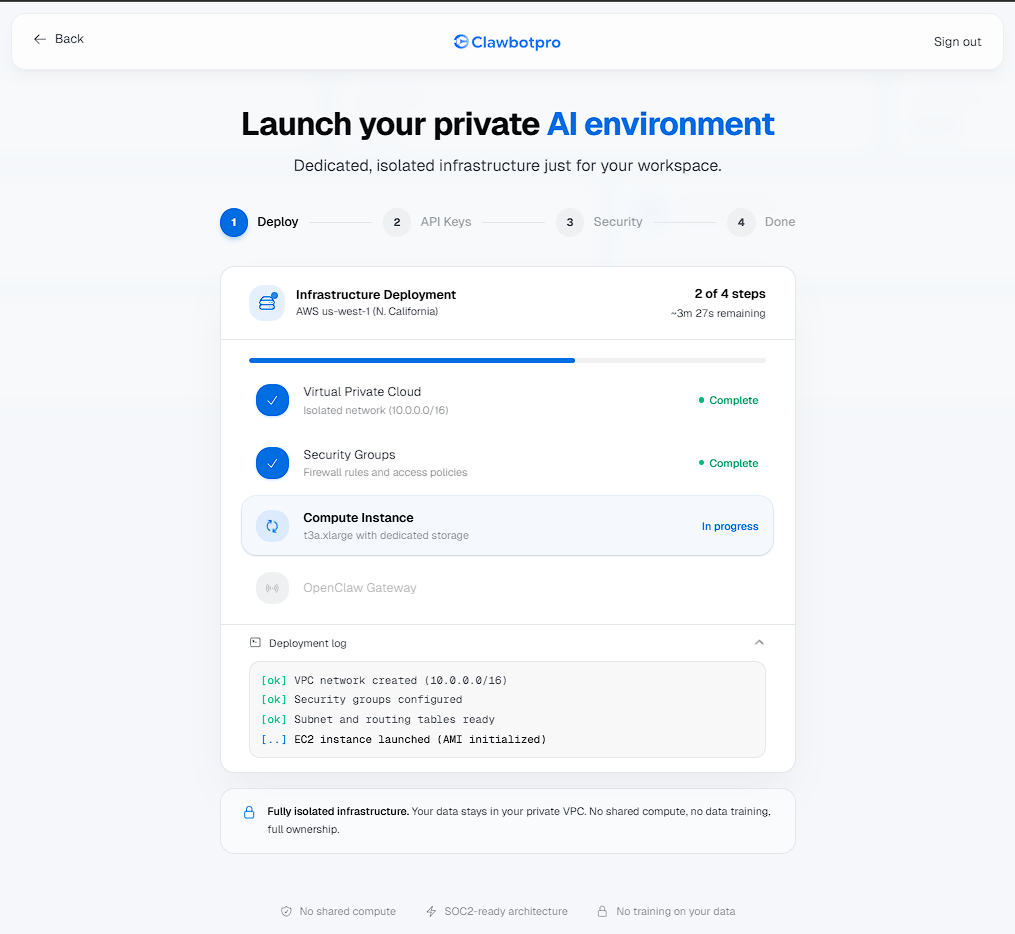 Unlike standard SaaS tools where your data shares space with thousands of other users, ClawbotPro operates on a Single-Tenant Architecture. When you onboard, the platform physically deploys a dedicated, isolated AWS environment (Virtual Private Cloud and Compute Instance) exclusively for your workspace. This ensures absolute data sovereignty, zero shared compute, and SOC2-ready isolation.