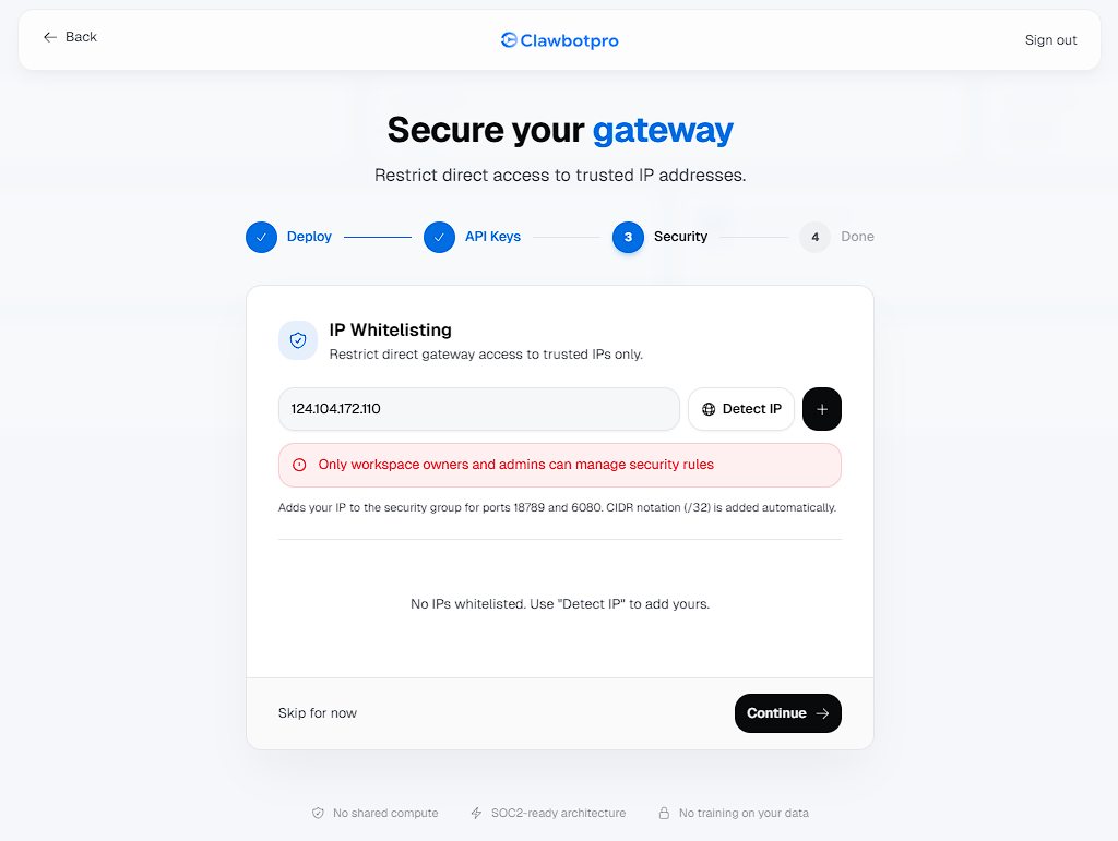 Using the Detect IP button automatically grabs your current public IPv4 address and injects it into the AWS Security Group using CIDR /32 notation. Only Workspace Owners and Admins have permission to modify these security rules.