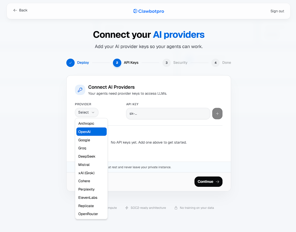 ClawbotPro agents utilize a "Bring Your Own Key" (BYOK) model. During this step, you securely connect API keys from providers like OpenAI, Anthropic, Google, and Groq.